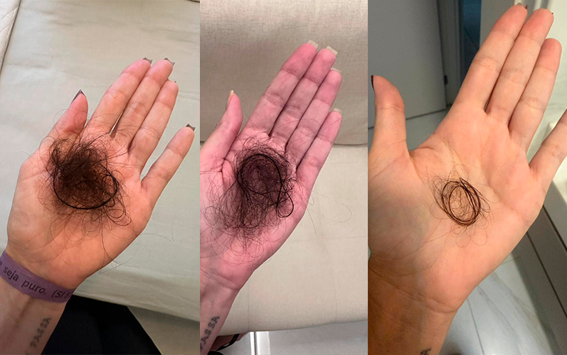 “Meu cabelo caía muito no banho. Depois de 4 semanas usando, a queda reduziu visivelmente.” Marcela, 34